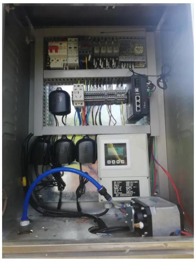 鄒工在現(xiàn)場調試,電磁流量計進行計量,數(shù)據(jù)通過云平臺進行監(jiān)控,現(xiàn)場總計裝有56臺分體式電磁流量計。