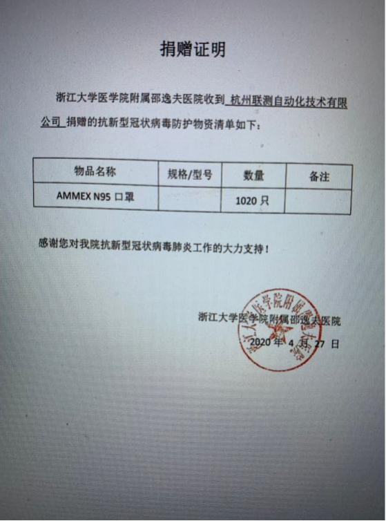 自新冠肺炎疫情爆發(fā)以來(lái),杭州聯(lián)測(cè)自動(dòng)化有限公司累積向邵逸夫醫(yī)院捐贈(zèng)1020只N95醫(yī)用口罩,為當(dāng)?shù)氐目挂咭痪€的醫(yī)護(hù)人員提供一份保障。