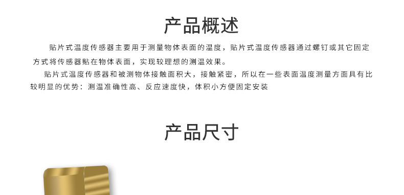 貼片式溫度傳感器主要用于測(cè)量物體表面的溫度,貼片式溫度傳感器通過(guò)螺釘或其它固定方式將傳感器貼在物體表面,實(shí)現(xiàn)較理想的測(cè)溫效果。