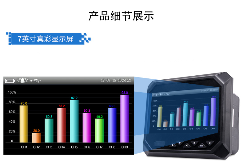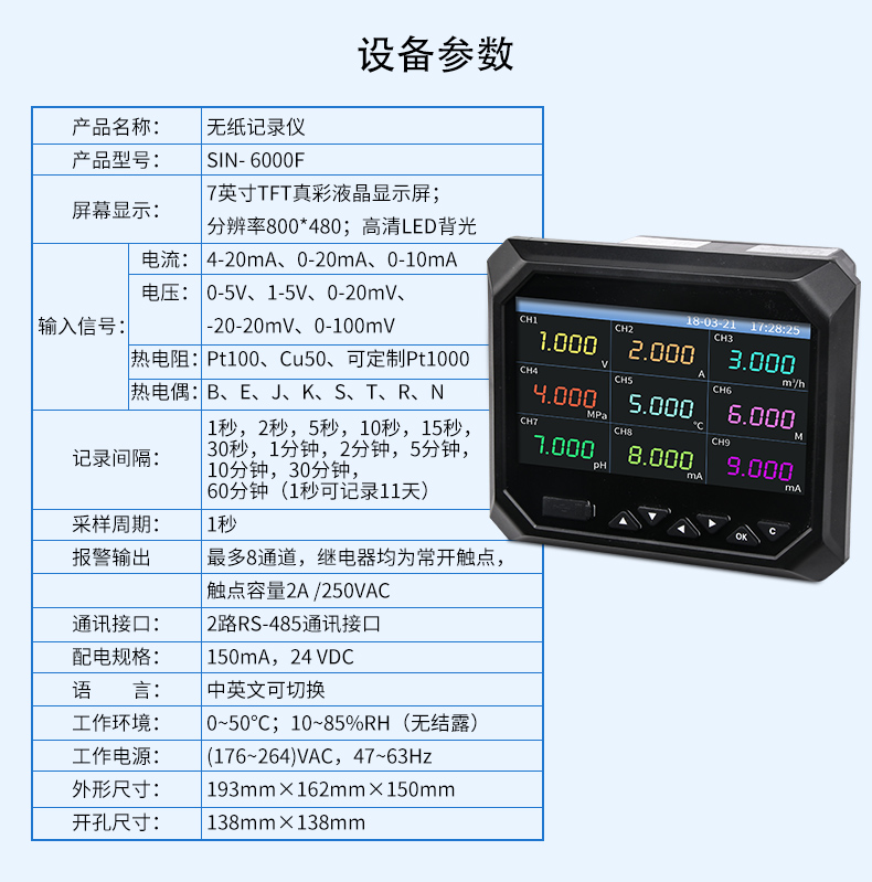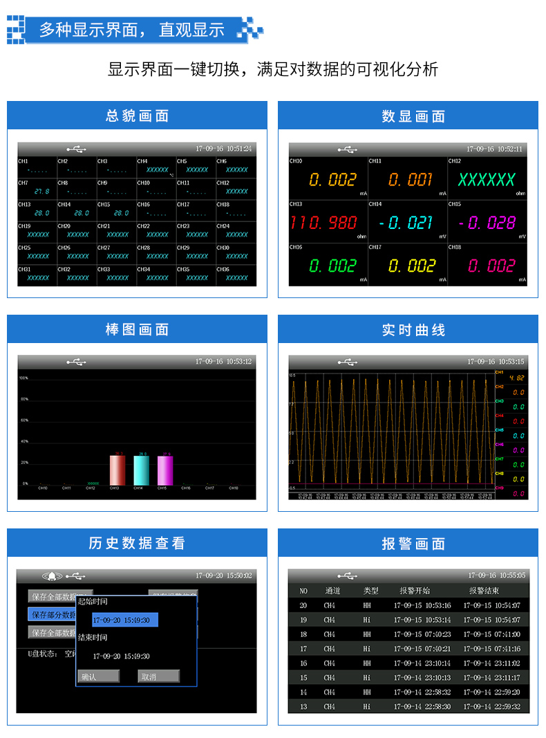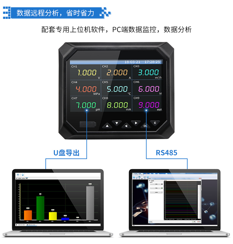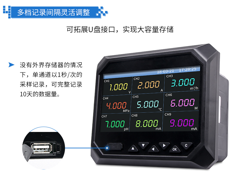 無(wú)紙記錄儀是將采集的數(shù)據(jù)/運(yùn)算數(shù)據(jù)以時(shí)間為基軸記錄在儀器內(nèi)部的存儲(chǔ)系統(tǒng)中,無(wú)消耗任何常用的記錄設(shè)施,如:紙張、筆墨。記錄在儀器內(nèi)部的存儲(chǔ)數(shù)據(jù),通過(guò)運(yùn)算、模擬后顯示在液晶屏。常用顯示用液晶屏比較廣泛。在液晶屏屏幕上,可以顯示數(shù)字顯示、棒圖顯示、曲線顯示、報(bào)警列表等。無(wú)紙記錄儀采集的數(shù)據(jù),常用的有:溫度、壓力、流量、液位、電壓、電流、濕度、頻率、振動(dòng)、轉(zhuǎn)速等。