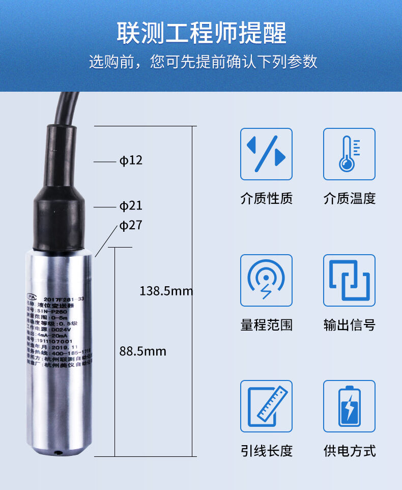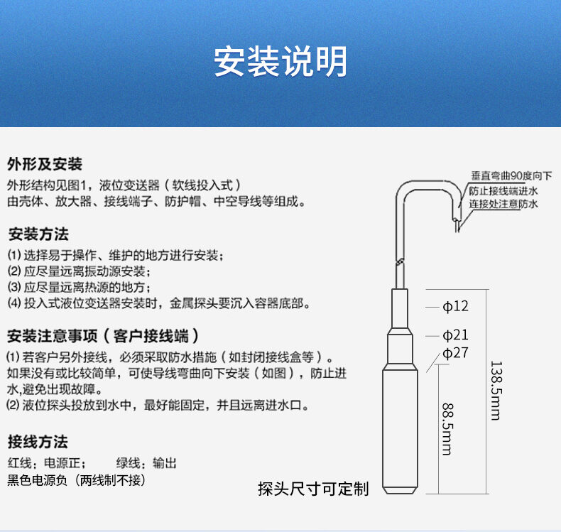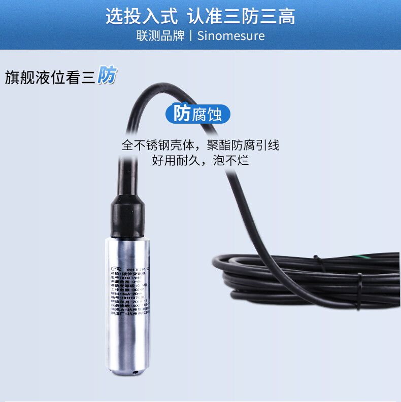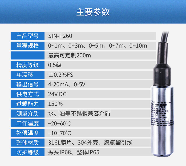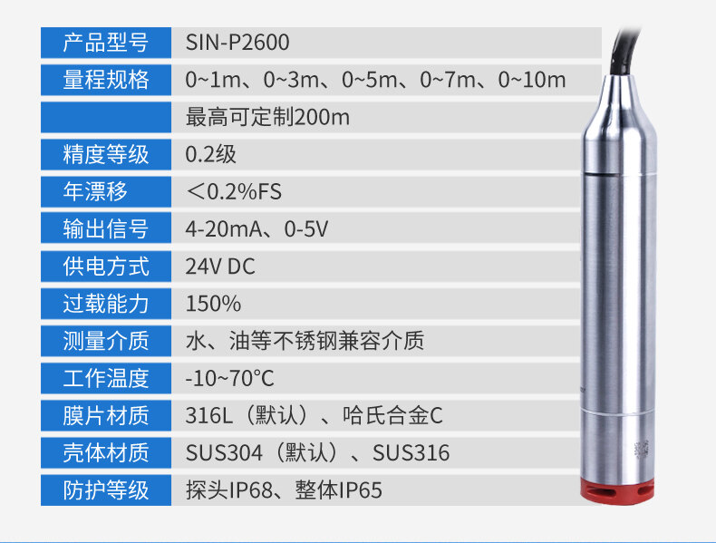 SIN-P260/P2600投入式液位變送器由高性能擴(kuò)散硅壓阻式壓力傳感器作為測(cè)量元件,把與液位深度成正比的液體靜壓力準(zhǔn)確測(cè)量出來(lái),并經(jīng)過(guò)信號(hào)調(diào)理電路轉(zhuǎn)換成標(biāo)準(zhǔn)(電流或電壓)信號(hào)輸出,建立起輸出信號(hào)與液體深度的線(xiàn)性對(duì)應(yīng)關(guān)系,實(shí)現(xiàn)對(duì)液體深度的測(cè)量。
